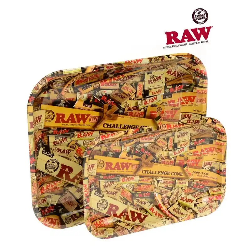 Fan de la marque Raw ? Vous avez l’habitude de rouler vos cigarettes avec ces papiers naturels et non raffinés ? Vous allez adorer ce plateau Raw affichant des feuilles à rouler ! Fabriqué en métal, il est décliné en deux modèles. Le nom de la marque apparaît à de multiples reprises, sur les dizaines d’ emballages de ces papiers avec lesquels vous réalisez vos cônes de cigarettes.