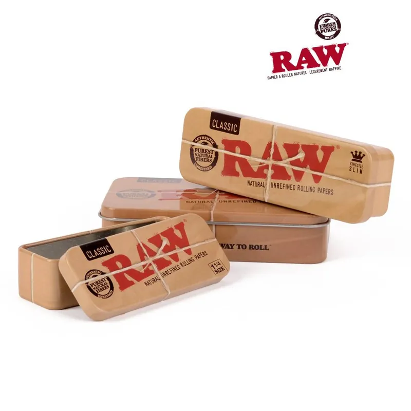 Boite en métal de la fameuse marque RAW, pratique pour transporter ses cigarettes et son nécessaire à rouler.