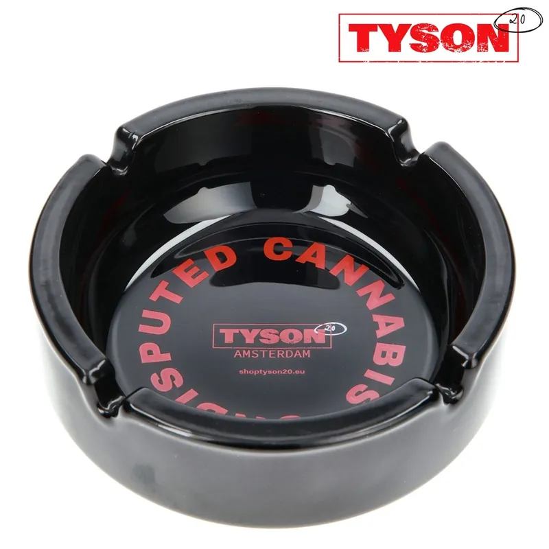 Au fond du cendrier, le logo TYSON 2.0 rouge sur fond noir est encadré du texte circulaire UNDISPUTED CANNABIS, dans une typographie épaisse et dynamique.