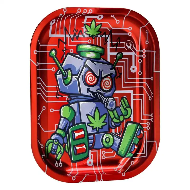 Le plateau présente un joli fond rouge métallisé avec des détails de circuits électroniques, tandis que le premier plan est décoré d’un robot gris très stylé carburant très certainement aux feuilles de chanvre, ajoutant une touche de modernité à votre expérience de roulage.
