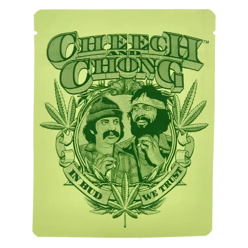 Ce sachet arbore une illustration unique inspirée du duo comique Cheech & Chong, avec leur célèbre logo « In Bud We Trust ».