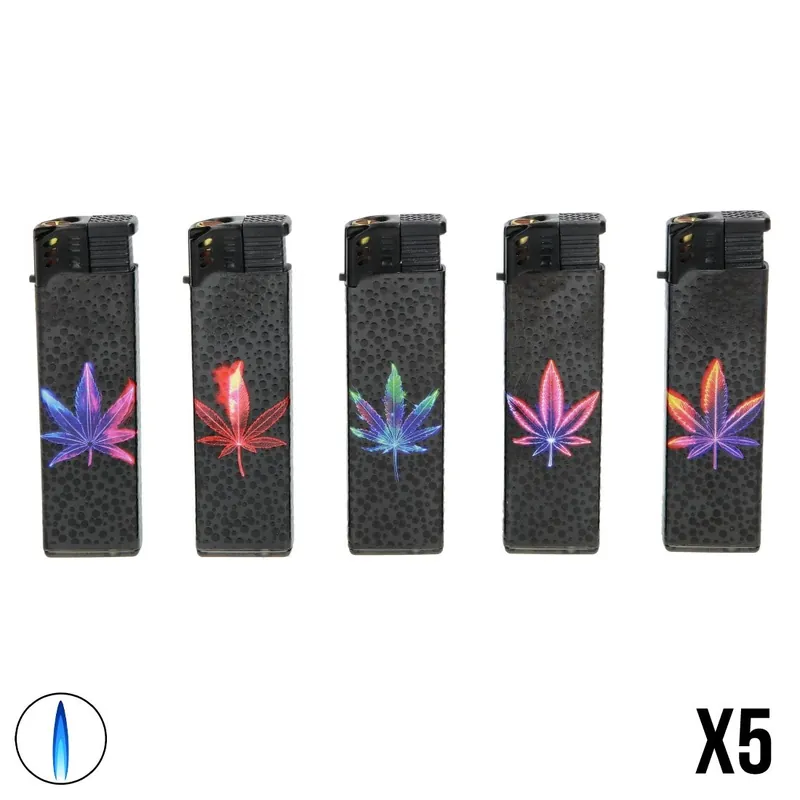 Ce lot de 5 briquets Tobaliq met en avant un design original autour du thème Luminous Buds, avec des feuilles de chanvre stylisées et colorées.