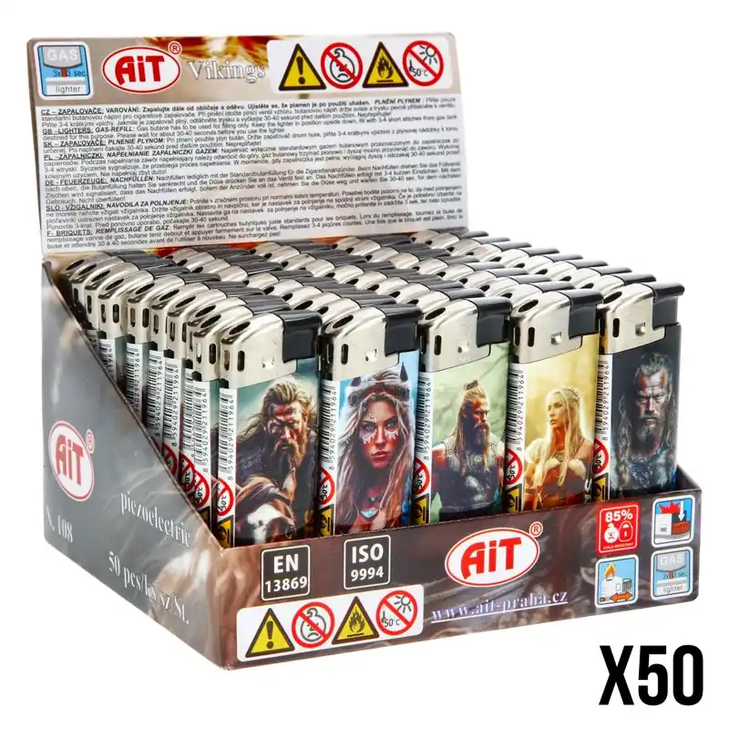 Plongez dans l’univers des Vikings avec ce display de 50 briquets électroniques, chaque pièce décorée de personnages emblématiques comme Ragnar et Lagertha !