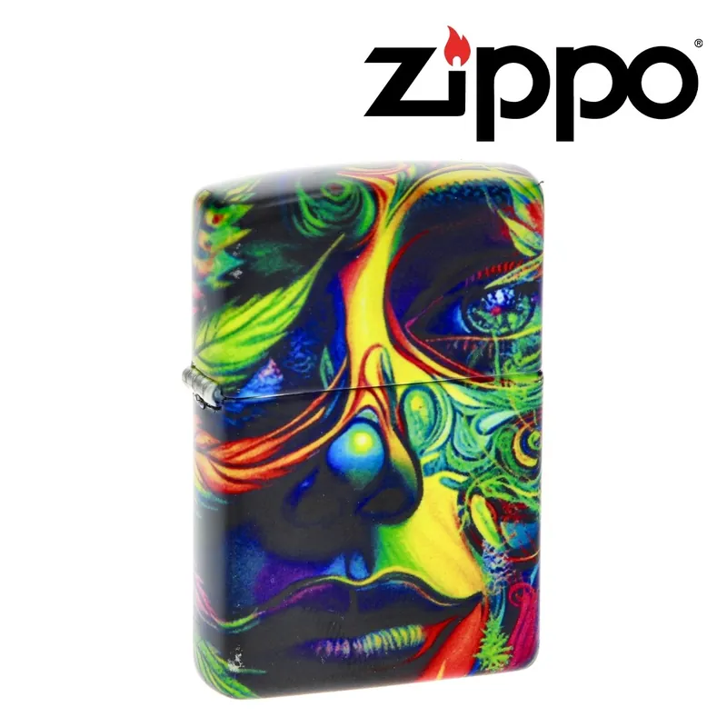 Le Zippo Lady Cannabis affiche un portrait féminin au style surréaliste, mêlant teintes vertes, bleues, jaunes et orangées pour un rendu visuel captivant.