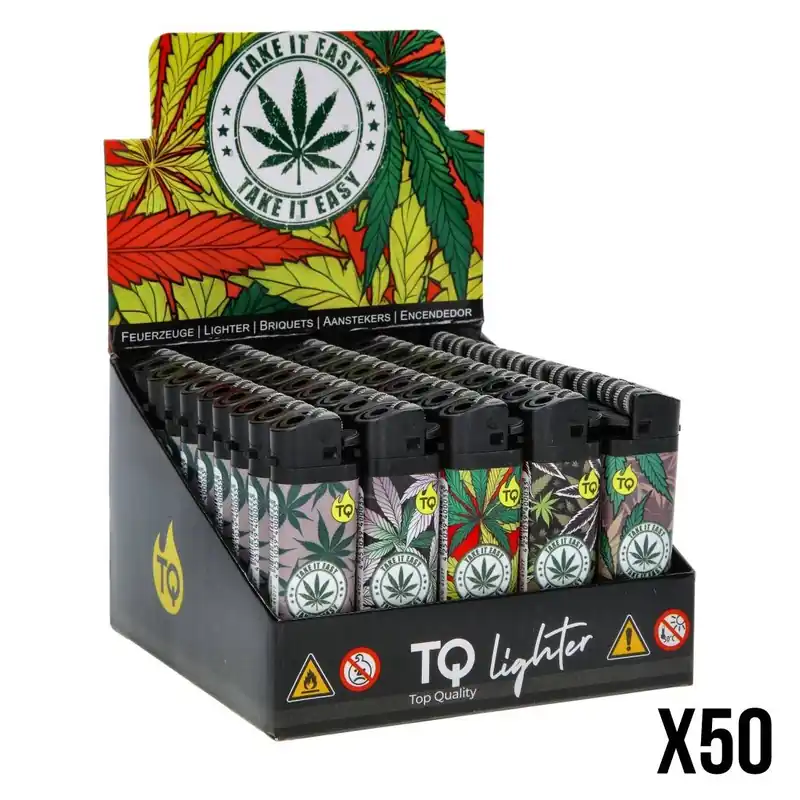 Le display de 50 briquets TQ Lighter Take it Easy 2 présente une collection unique de motifs, alliant feuilles de chanvre et détails colorés, avec des slogans ludiques comme « Take it Easy ». Chaque briquet se distingue par son style audacieux, idéal pour ceux qui cherchent à afficher leur personnalité tout en gardant un accessoire pratique à portée de main !
