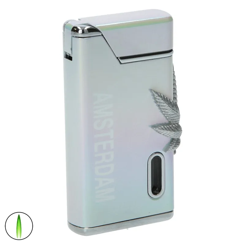 Le briquet Belflam Turbo Pearl Amsterdam Leaf allie élégance et puissance avec sa finition argent perle et sa grande feuille en relief.
