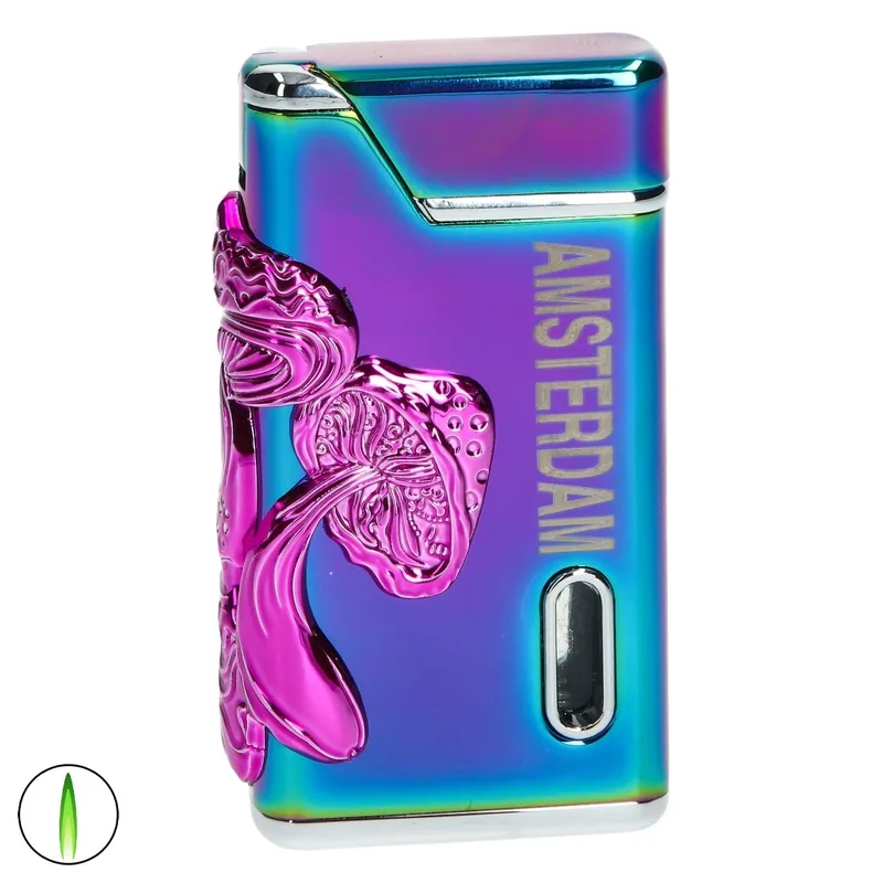 Ce briquet chalumeau métal de la marque Belflam est équipé d’un visuel en relief de champignons, apportant une touche plutôt et assez stylée !