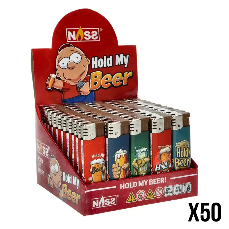 Apportez une touche de fun et de convivialité à vos moments avec le display de 50 briquets électroniques Nass Hold My Beer, idéal pour ne jamais manquer d’un briquet au style unique !