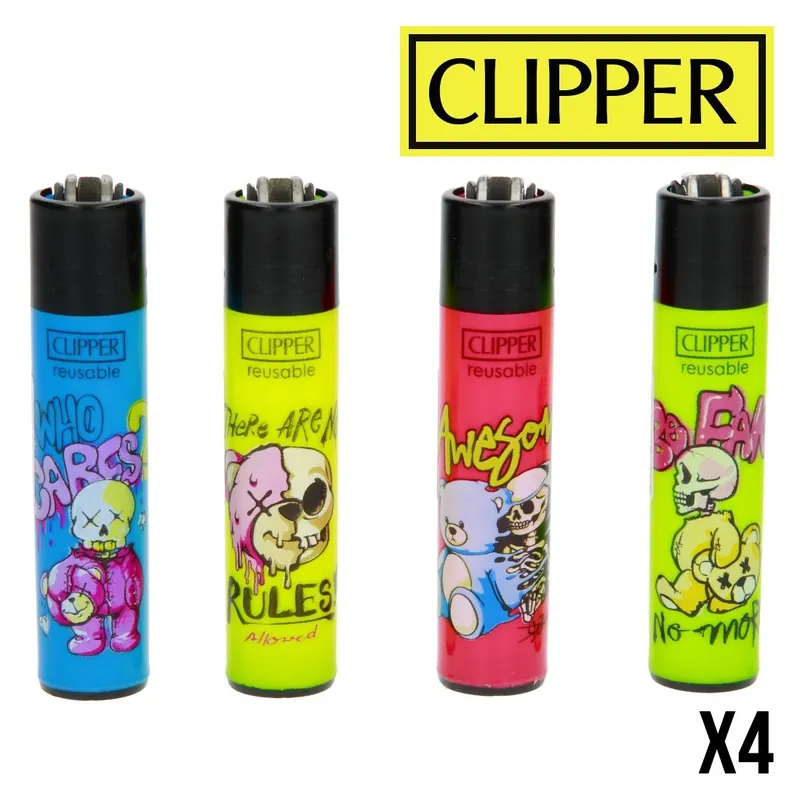 Le Clipper Bear Skulls rassemble 4 briquets au format classique de 7,7 x 2,3 x 1,7 cm, chacun orné d’un visuel crâne unique et coloré.