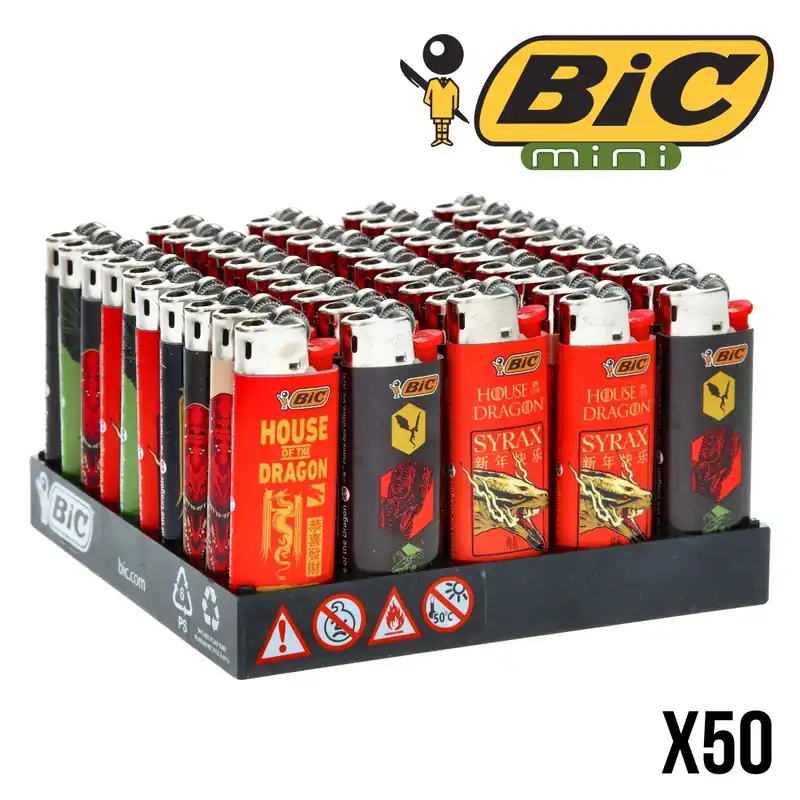 Ce display de 50 briquets Bic Mini est décoré avec des motifs inspirés de la célèbre série House of the Dragon.