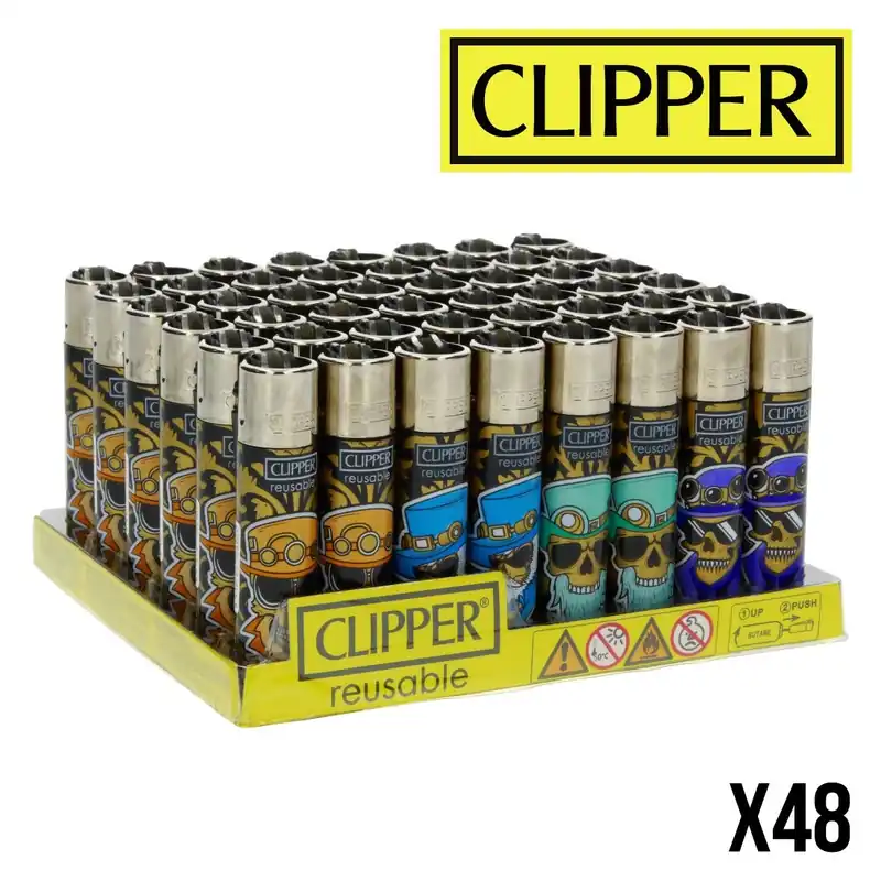 Ce display regroupe 48 briquets Clipper Classic décorés de crânes stylisés et d’accessoires steampunk façon lunettes à rivets et chapeaux haut-de-forme.