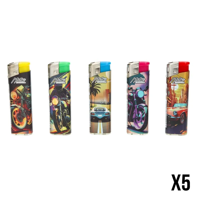 Le lot de 5 briquets électroniques Matteo Laser Motors and Cars se distingue par son esthétique unique.