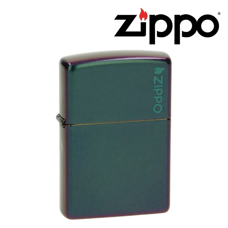 Le Briquet Zippo Iridescent Matte Logo se distingue immédiatement par sa finition irisée mate aux reflets turquoise et violets qui évoluent selon l’angle de vue.