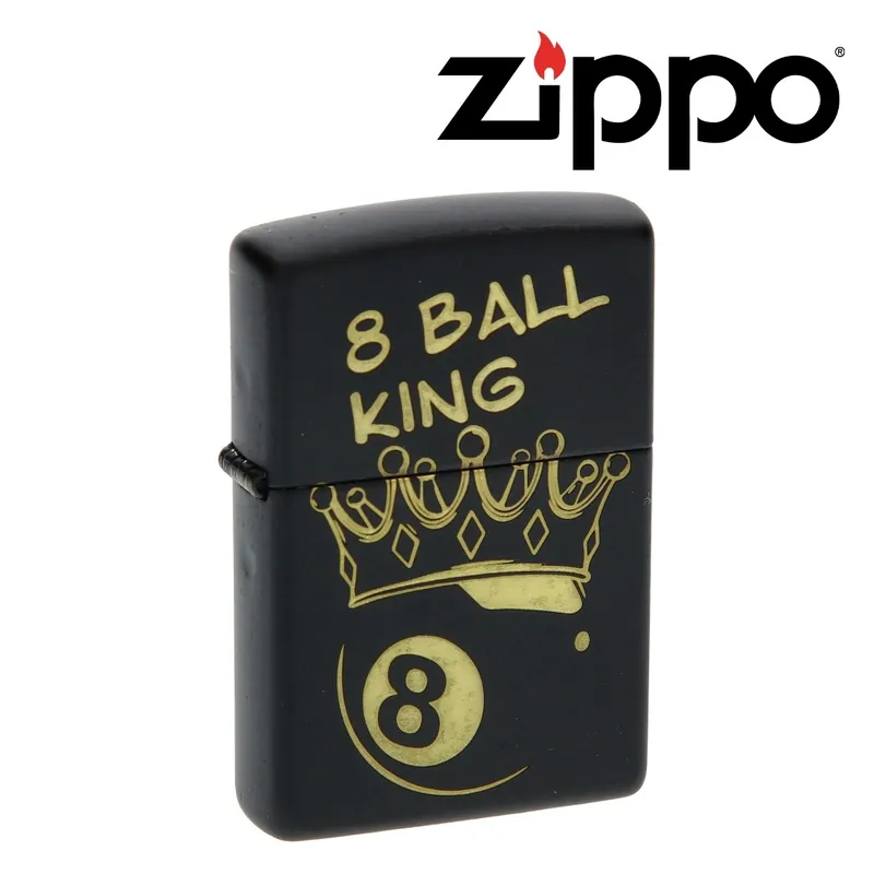 Ce briquet Zippo se distingue par un visuel centré sur la célèbre bille noire n°8, accompagnée de l’inscription “8 BALL KING” et d’une large couronne dorée.
