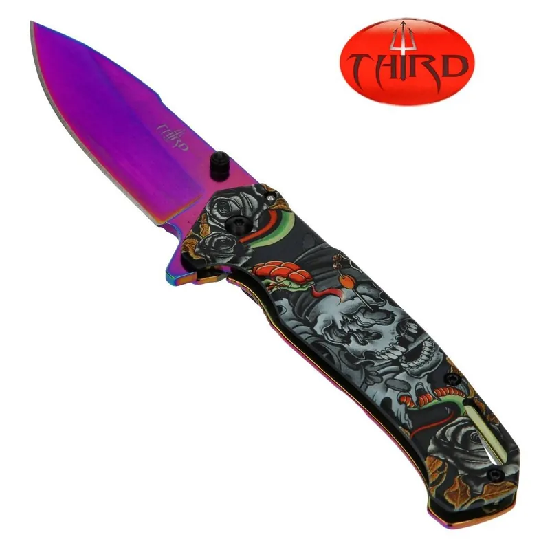 Le couteau pliant Third Squelette, orné d’un attrayant motif arc-en-ciel sur l’acier inoxydable de sa lame, est l’expression suprême du design et de la fonctionnalité.