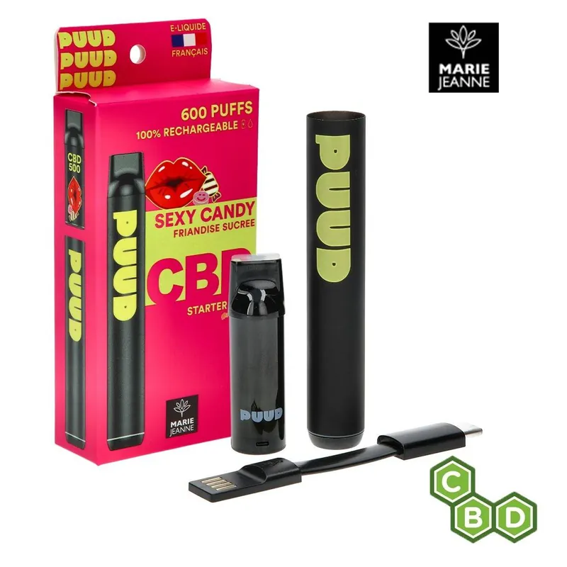 - Inclut une batterie rechargeable type puff, une cartouche au CBD saveur Sexy Candy, et un chargeur