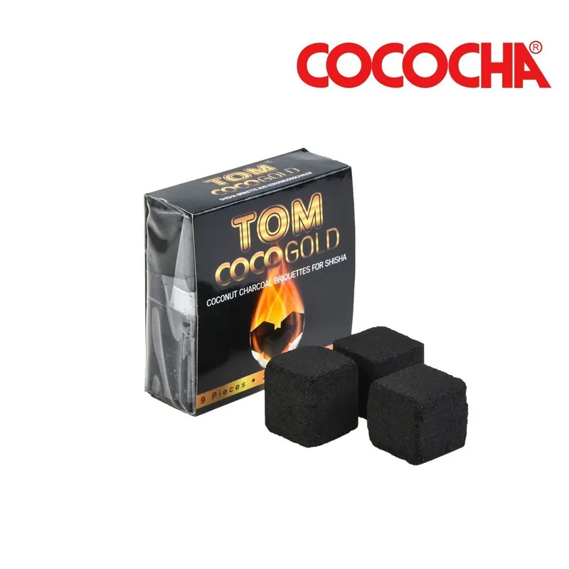 Le charbon Cococha Gold Cocominis est proposé en petit conditionnement, avec une boîte contenant 9 cubes de 25 mm de côté.