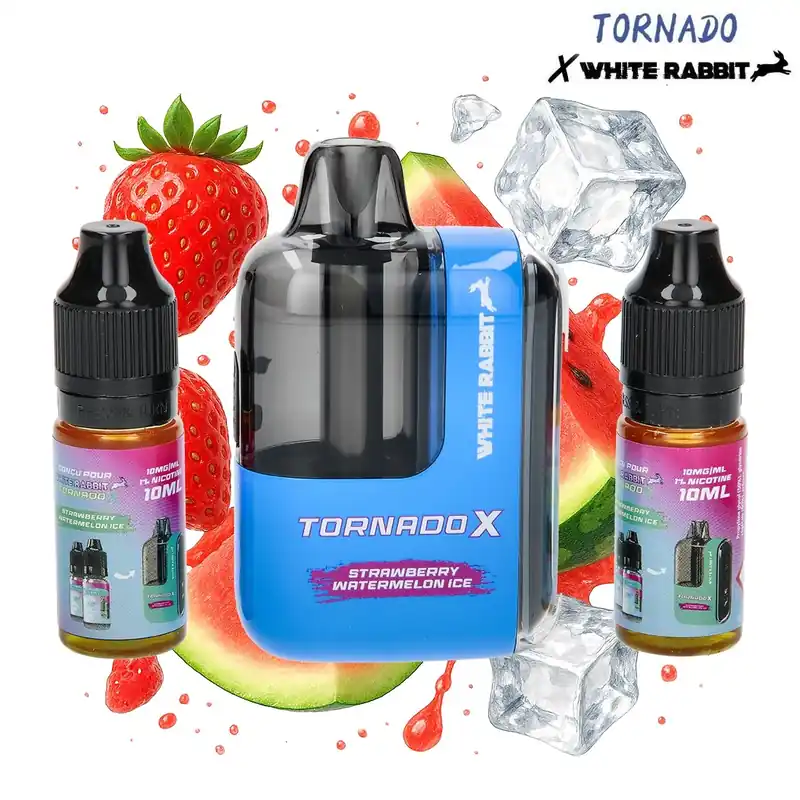 Offrez-vous une escapade fruitée avec la Tornado X 25K Strawberry Watermelon, la puff rechargeable qui mélange douceur de la fraise et jutosité de la pastèque.