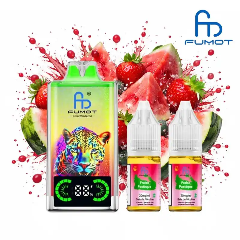 Grande capacité, design léopard assumé et duo fruité équilibré : la Puff Fumot Leopard 40K Fraise Pastèque 20mg combine autonomie et fraîcheur maîtrisée.