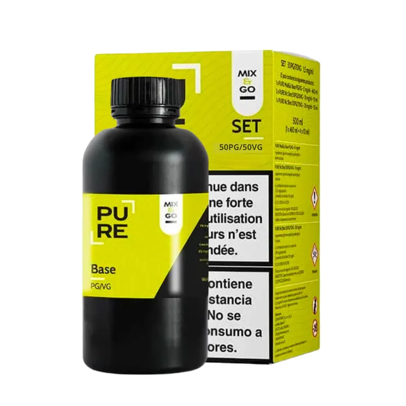 Le Pack 500 ml Base DIY Mix&;Go 50/50 PURE est une solution pratique et prête à l’emploi pour les vapoteurs qui souhaitent fabriquer eux-mêmes leur e-liquide nicotiné, sans se compliquer la vie avec des calculs ou des manipulations fastidieuses.