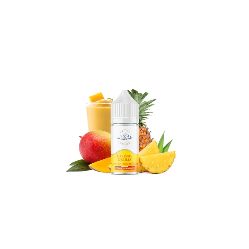 Envie d’un délicieux smoothie mangue ananas gorgé de soleil, ultra désaltérant, doux et sucré à la fois ? Optez pour le concentré Caresses des Îles 30 ml imaginé par les aromaticiens de chez Petit Nuage !