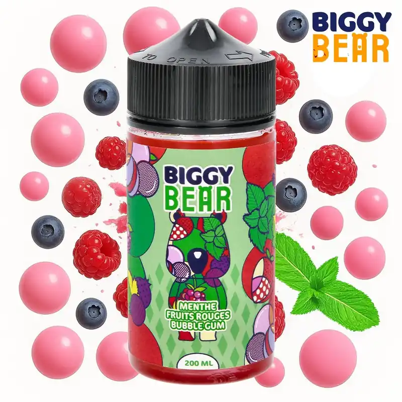 Le Biggy Bear Menthe Fruits Rouges Bubble Gum est proposé dans un format généreux de 200ml prêt à l’emploi, mais sans nicotine.