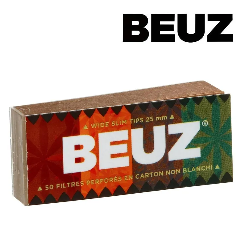 Beuz vous affiche des filtres tips en carton non blanchi (« brown »), larges de 25 mm et parfaits pour rouler des cigarettes « propres ».