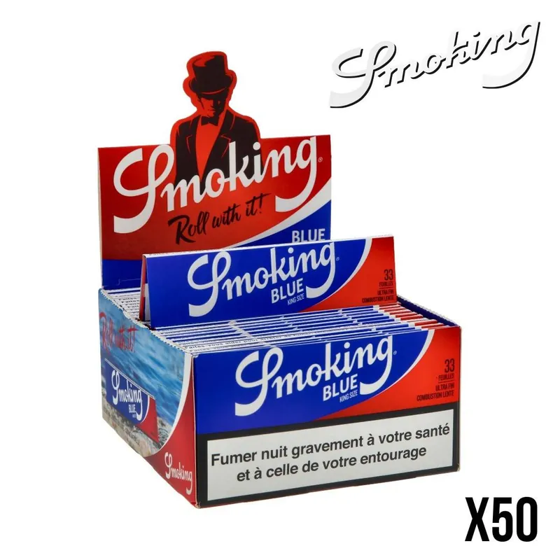 Boite de 50 carnets « Blue » de feuilles à rouler grand format (King size) de la célèbre marque Smoking®