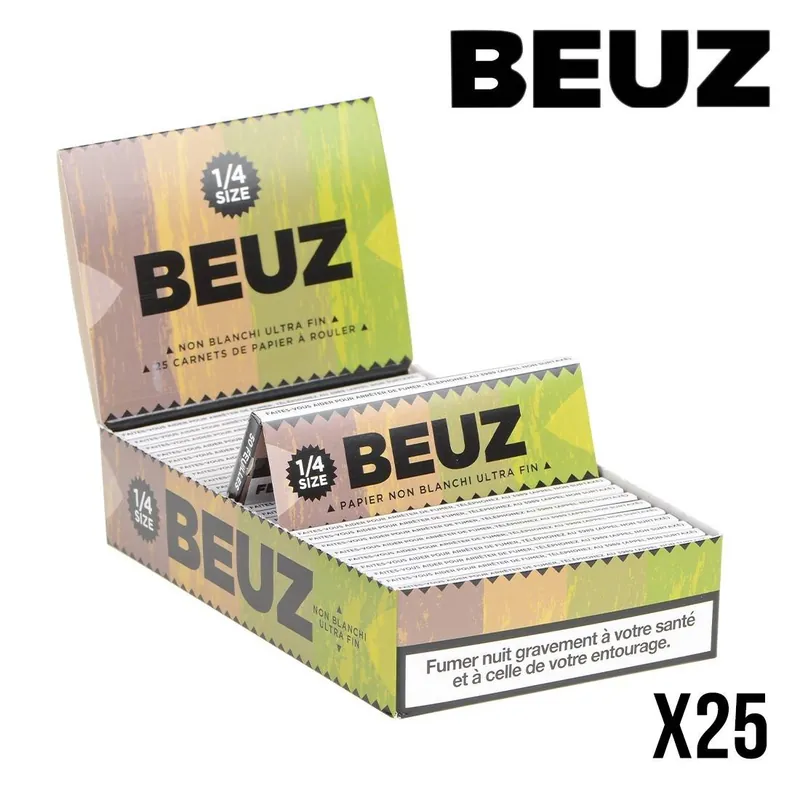 La marque bretonne BEUZ, connue pour la qualité exceptionnelle de son papier à rouler, introduit son format 1/4 dans une boîte de 25 carnets. Chaque carnet contient 50 feuilles non blanchies, également connues sous le nom de « format espagnol ». Ces feuilles ultra-fines, disponibles à un prix compétitif, sont exemptes de tout produit chimique, rendant votre expérience de fumage bien plus saine.