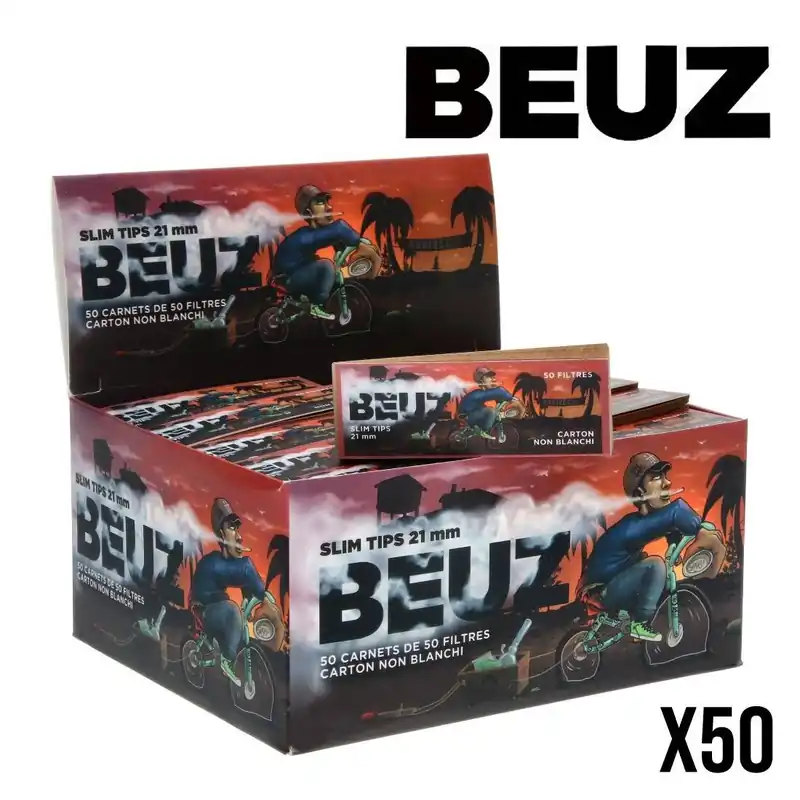 La marque bretonne Beuz vous propose la tranquillité avec un display de 50 carnets de filtres tips slim en carton : l’accessoire indispensable de votre session fumeur.