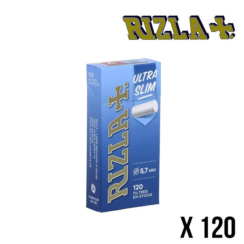 Paquet rigide de 120 filtres ultra slim en acétate de la célèbre marque Rizla, leader mondial du papier à cigarette. A l’intérieur de cette boite vous y retrouverez 20 sticks de 6 filtres 5.7mm.
