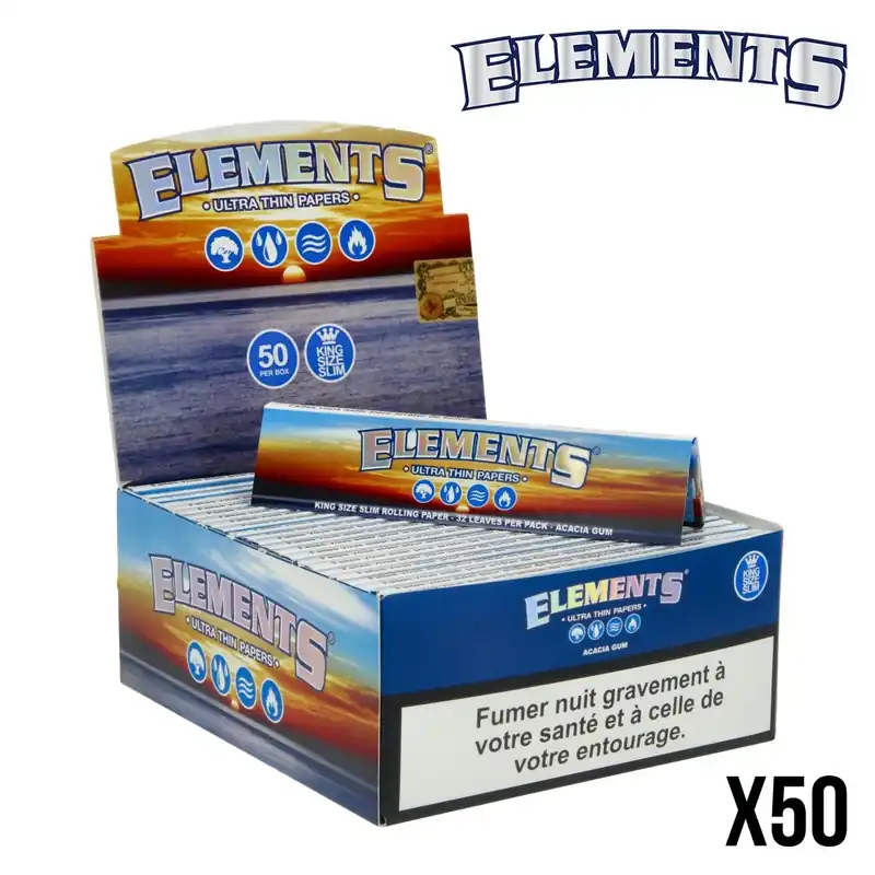 Le papier à rouler ELEMENTS x50 comprend 50 carnets, chacun contenant 33 feuilles king size slim, soit un total de 1650 feuilles.