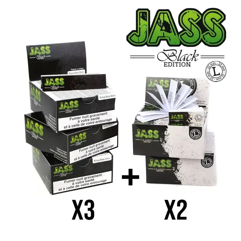 Ce pack contient 3 boîte de feuilles à rouler Jass-paper King Size Slim Black edition + 2 boîtes de filtres en 22 mm (Taille L).
