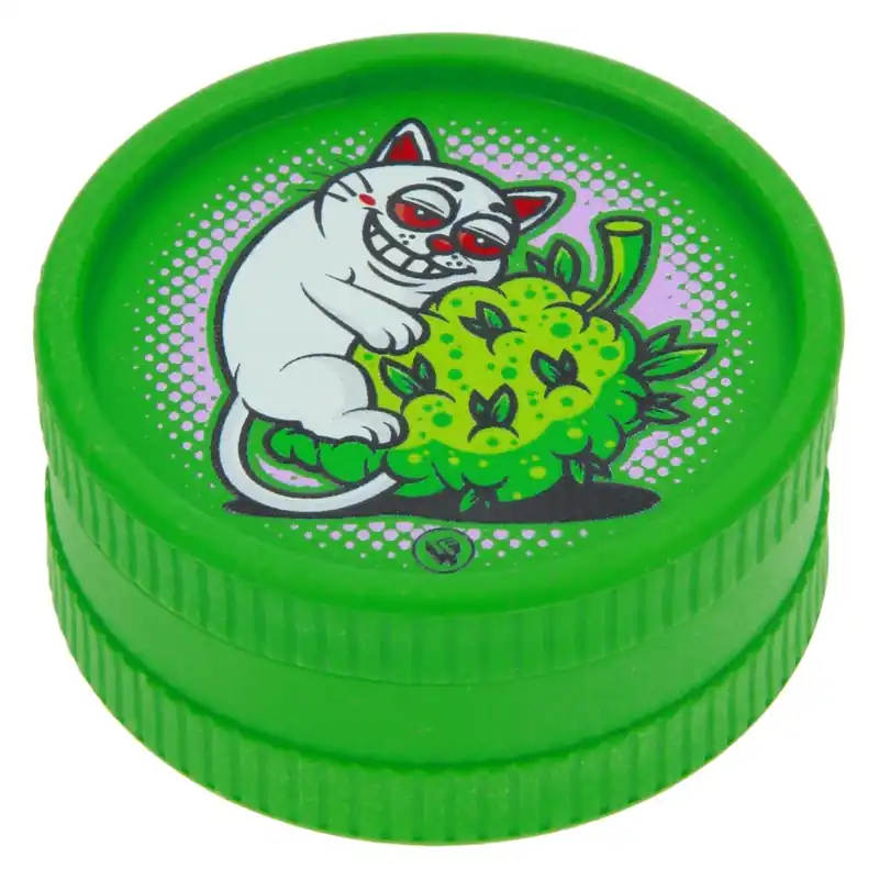 Avec son illustration décalée d’un chat hilare perché sur un bouquet feuillu, ce grinder ne passe clairement pas inaperçu.