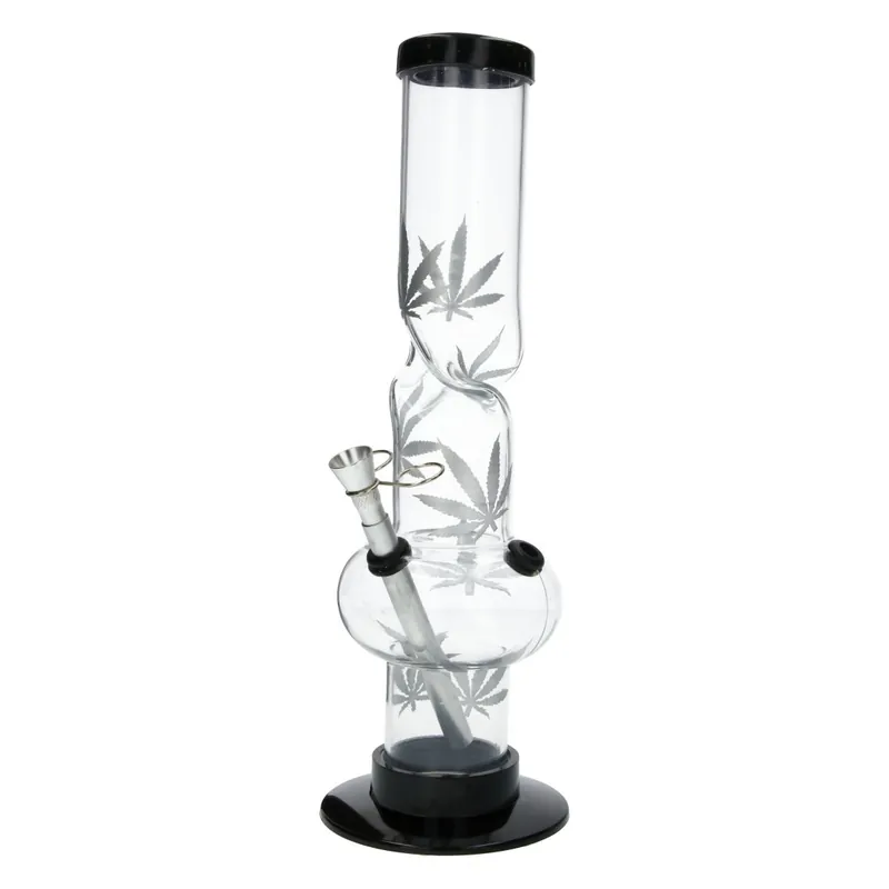 Ce bang en acrylique présente un corps transparent qui laisse apparaître des motifs de feuilles peints sur la surface.
