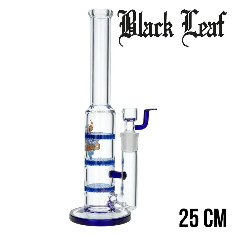 Le joint femelle renforcé de 14,5 mm est accompagné d’une douille en verre transparent de 14,5 mm avec une poignée bleue, non seulement pratique pour une manipulation aisée sans se brûler, mais aussi pour empêcher la douille de rouler accidentellement. Le design sans tige de Black Leaf et l’étiquette HoneyComb complètent le look moderne et fonctionnel de ce bang.