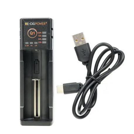 Voici un aperçu des caractéristiques techniques du chargeur Q1 LED par E-Cig Power :· Marque : E-Cig Power· Types d’accumulateurs pris en charge : Batteries Li-On 3.6V/3.7V, Ni-MH, Ni-CD, AAAA, AAA, AA, A, SC, C et F6· Alimentation : DC5V 2A· Courant de charge réglable : 0.5A, 1A ou 2A· Courant de décharge : 0.5ALe chargeur Q1 LED est fabriqué par E-Cig Power. Il est livré avec un câble micro-USB et une notice utilisateur pour vous guider dans son utilisation. Grâce à sa polyvalence, son design élégant et ses fonctionnalités avancées, le chargeur Q1 LED est un choix idéal pour tous les amateurs de cigarettes électroniques qui recherchent un chargeur de qualité.